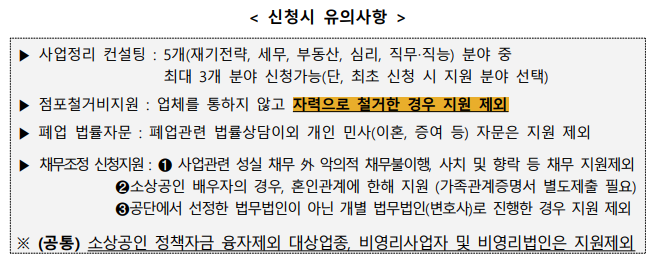 폐업지원금은 희망리턴패키지 홈페이지를 통해 신청, 접수가 가능합니다. 4개분야(사업정리컨설팅, 점포철거지원, 법률자문, 채무조정) 중 희망하는 분야를 신청하면 되는데요. 아래 신청 시 유의사항을 참고하셔서 알맞은 지원을 받으시길 바랍니다.