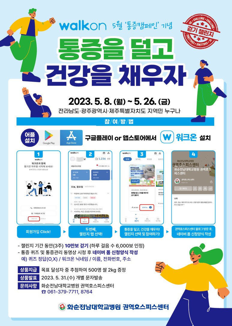 안녕하세요. 날씨가 이제 만연한 봄날씨가 되었고 걷기 좋은 계절이 되었습니다. 오늘은 화순전남대학교병원에서 진행하는 "통증을 덜고 건강을 채우자" 걷기 챌린지에 대해 알려드릴까 합니다.